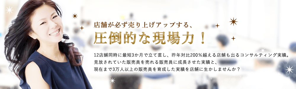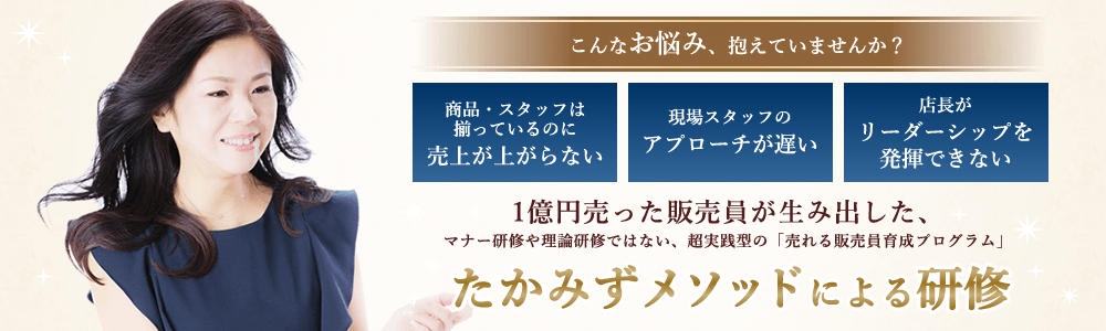 たかみずメソッドは、たかみず保江が27年間の販売員経験の中で自身の売れ続けた実績と、多くの不振店を目標達成に導いてきた経験を元に構築された、お客様が「また来たい!」と思える店舗になる販売員による、販売員のための、実践的な売れる販売員養成メソッドです。